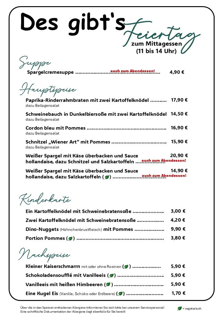 Achtung, diesmal auch am Feiertag (Vatertag) zum Abendessen!