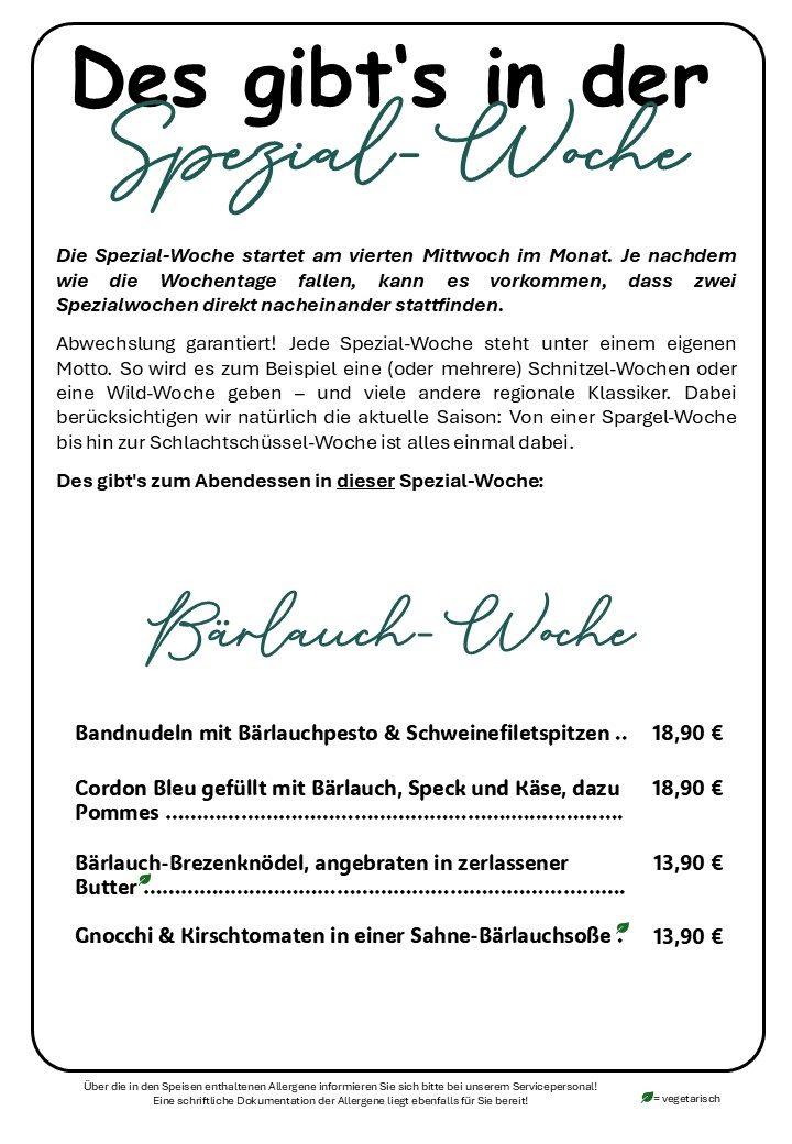 Abwechslung garantiert! Jede Spezial-Woche steht unter einem eigenen Motto. So wird es zum Beispiel eine (oder mehrere 😉) Schnitzel-Wochen oder eine Wild-Woche geben – und viele andere regionale Klassiker. Dabei berücksichtigen wir natürlich die aktuelle Saison: Von einer Spargel-Woche bis hin zur Schlachtschüssel-Woche ist alles einmal dabei.