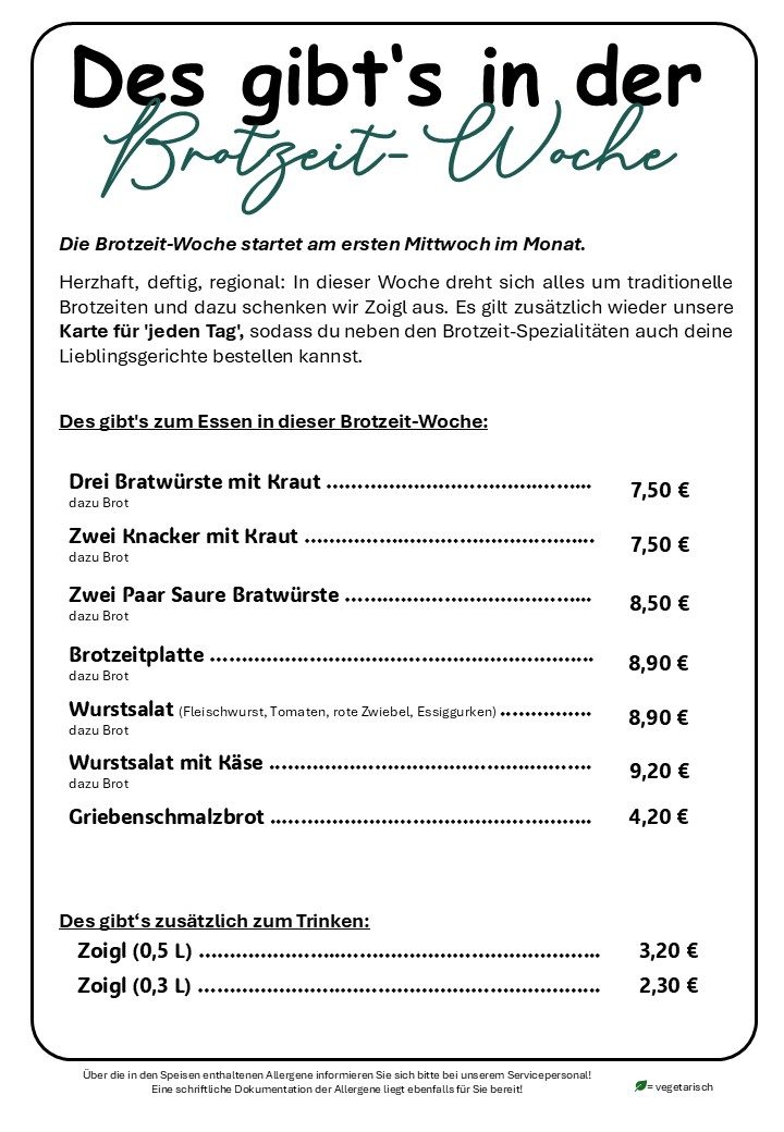 Herzhaft, deftig, regional: In dieser Woche dreht sich alles um traditionelle Brotzeiten und dazu schenken wir Zoigl aus. Außerdem gilt zusätzlich unsere Karte für 'jeden Tag', sodass du neben den Brotzeit-Spezialitäten auch deine Lieblingsgerichte bestellen kannst.
